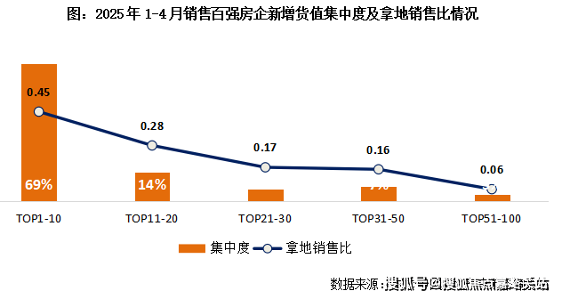 2025年1-4月销售百强房企拿地集中度依然维持高位,销售TOP10房企新增货值占销售百强新增货量的69%,较2024年末增加7个百分点,未来市场格局仍将集中于头部企业。