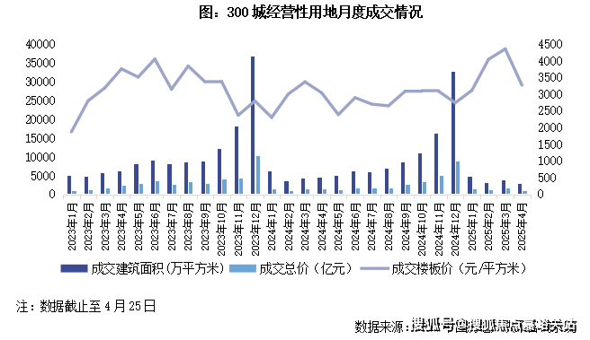 2025年1-4月,土地市场依旧呈现显著分化特征。以北京、杭州、广州、南京等为代表的一线城市及强二线城市土地成交溢价率持续攀升,核心区位优质地块频现高溢价成交现象,推动市场热度及关注度重回上行通道。但值得注意的是,本轮市场回暖呈现明显结构性特征,三四线城市仍量价同比回缩,市场复苏动能不足,实质性改善仍需依托区域经济基本面的修复及政策支持的持续性。